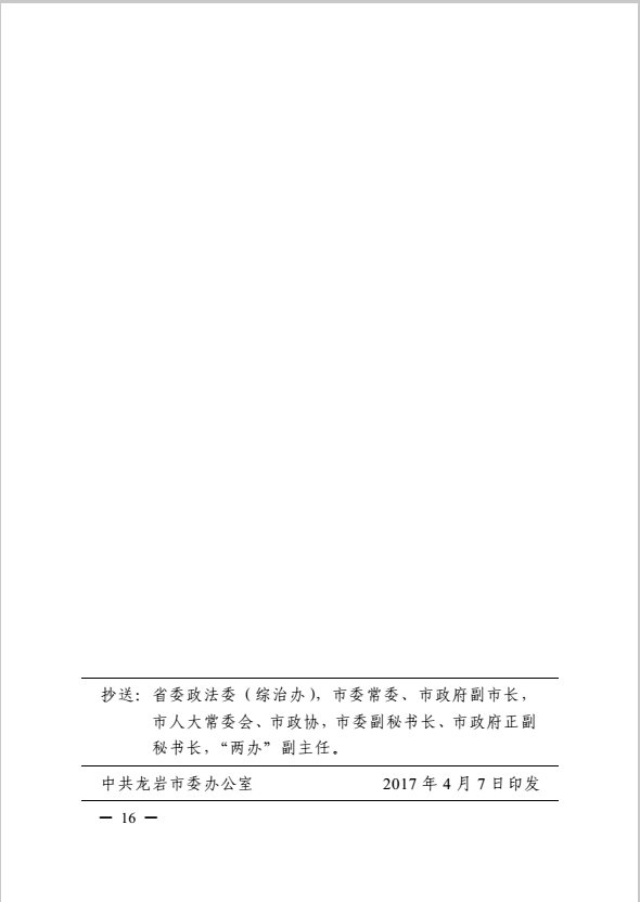 龍巖市健全落實(shí)社會(huì)治安綜合治理領(lǐng)導(dǎo)責(zé)任制實(shí)施細(xì)則(巖委辦發(fā)【2017】11號(hào))