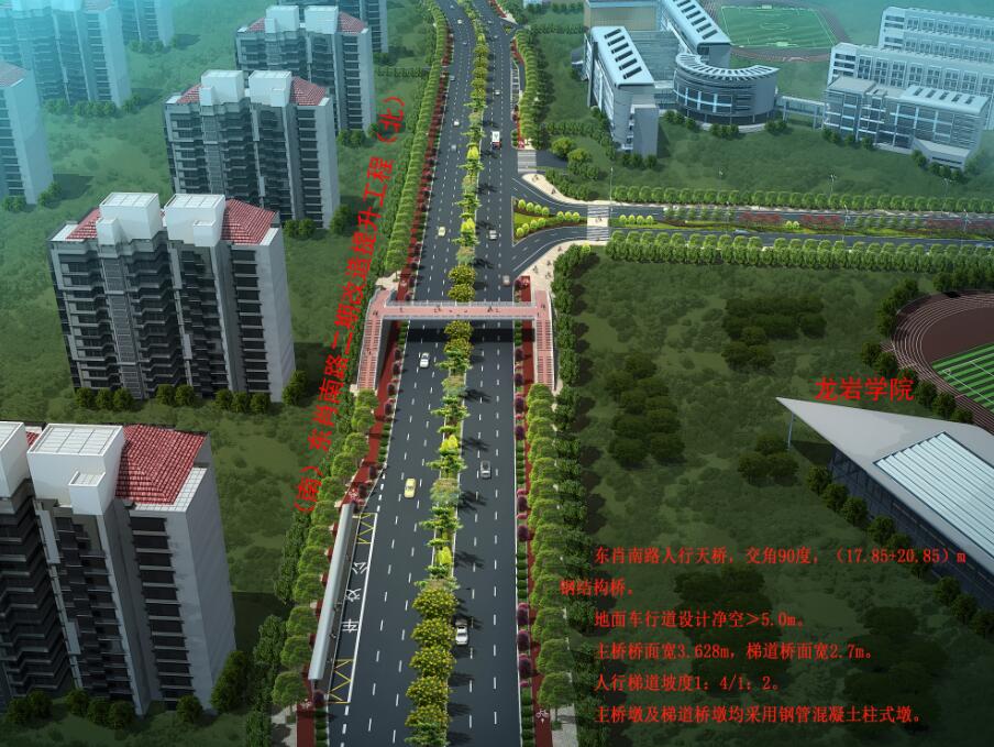 龍巖學院人行天橋位于龍巖學院大門北側(cè)約50米處,天橋采用“工”字形設計,橋面長40米、寬3.6米,兩側(cè)梯道坡度為1:4和1:2,跨度分別為17.85米和20.85米,寬2.7米,主橋墩及梯道橋墩均采用鋼管混凝土柱式墩,總投資約450萬元。